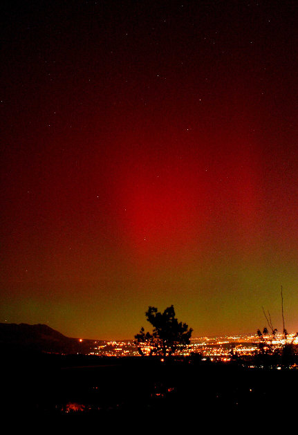 October 29, 2003 A brilliant display of the Northern Lights above Colorado Springs. Click here to view the white light filter photo of the sunspot that spawned this auroral display. Canon 10D, 24mm lens, 8 sec.