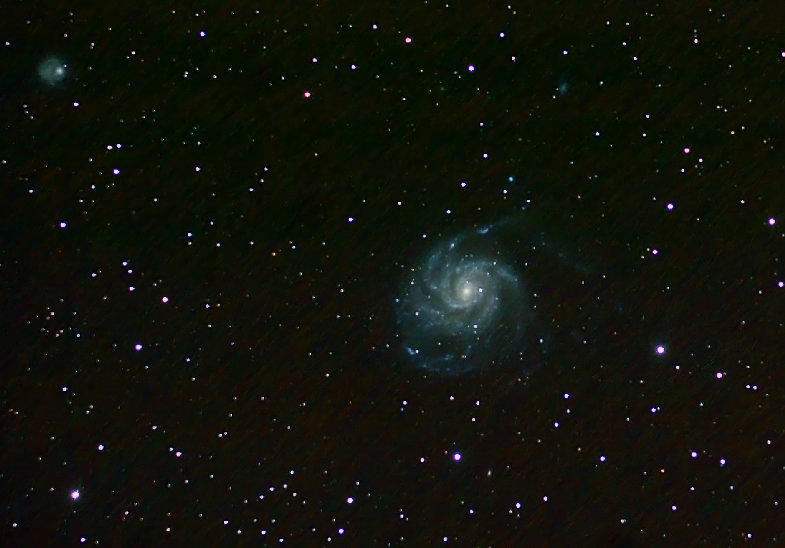 M 101 "The Pinwheel Galaxy" Located below the handle of the "big dipper" in Ursa Major, M101 is a beautiful spiral galaxy that is 190,000 + light years in diameter. The Pinwheel Galaxy is a member of the M101 Galaxy Group and is some 25 million light years from earth. Photo May 2007from Summit County with a Pentax 105SHDF apo refractor with a Canon 30D camera.