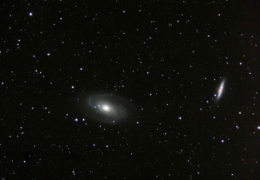 M 81 and M 82 Galaxies in Ursa Major. February 2004. M81 is a beautiful spiral some 4.5 million light years from Earth. The needle shaped M 82 is 17 million light years distant. M81 plowed through M82 200 million years ago resulting in about 40 supernovae exploding in the intense central region of the needle! Technical: Canon 10D, Pentax 105 SHDF APO at prime focus. 5 x 5 min exposures. Summit County, CO.