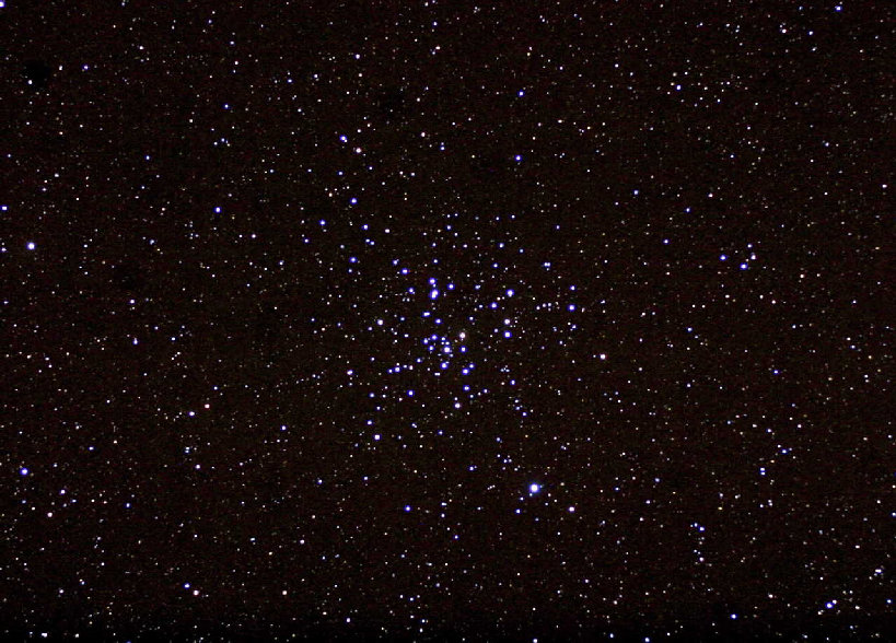 M41 Open Cluster in Canis Major. M41 is also known as the Little Beehive Cluster". It is located south of Sirius and is one of the faintest objects noted in antiquity. Aristotle in 325 BC described it as a star with a tail...It takes a pristine dark sky location to see it with the unaided sky... This cluster is about 2,100 light years from earth. Pentax 105 SHDF APO refractor, Canon 10D, stack of 7x60 sec exposures, Colorado Springs, December 2003.