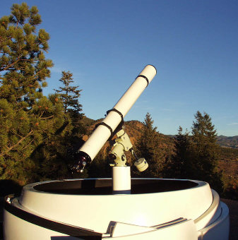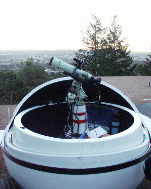 (L) Colorado Springs Observatory: Astrohaven Dome, Takahashi EM200 TEMMA mount, Brandon 130 APO f/8 (Roland Christen triplet refurbished winter 2003) or AP 178 Starfire APO f/9 (pictured)