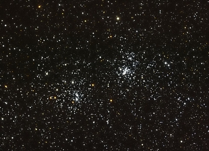 The Double Cluster in Perseus. A spectacular sight in binoculars or a telescope even in light polluted suburban areas! The Double Cluster consists of two young star clusters 7000 + light years from earth. This is a stack of 60- 90 sec exposures with a Canon 10D and Pentax 105 SHDFf/6.7 APO refractor taken in Summit County.