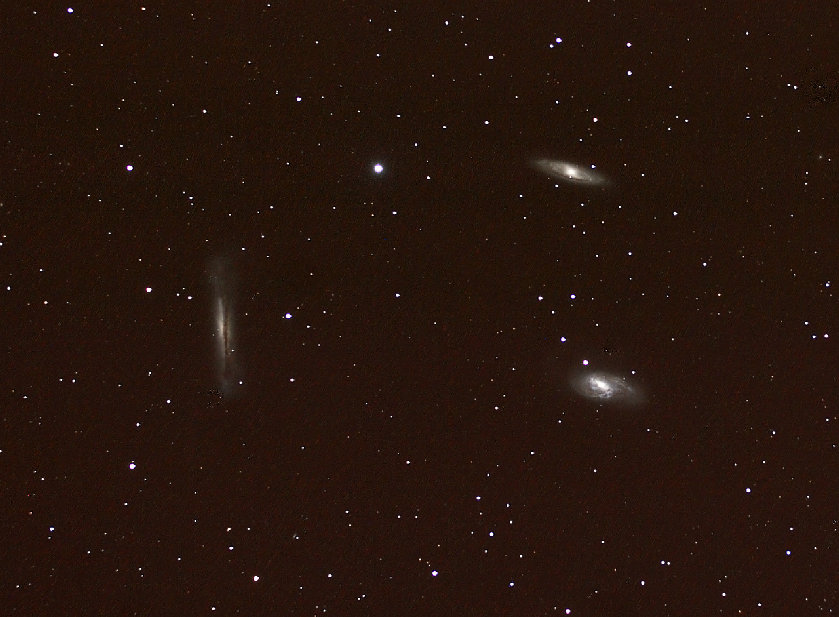 Leo Trio of Galaxies. The spring constellations of Leo and Virgo abound with many galaxies to view and photograph. Galaxies are "faint fuzzies" to observe and are also difficult to photograph due to their low surface brightness. This trio is a classic consisting of M65 , M66, and the edge-on spiral NGC 3628 (left). Summit County, CO Pentax 105SHDF, Canon 30D, Spring 2007